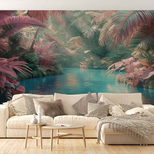 WonderMuralUnsere Tapete entführt Sie in eine atemberaubende tropische Landschaft, in der ein ruhiger Fluss unter einem Himmel in Rosa- und Orangetönen reflek...
