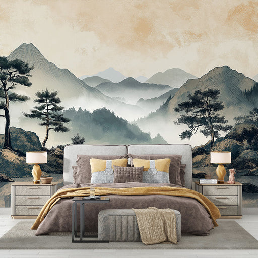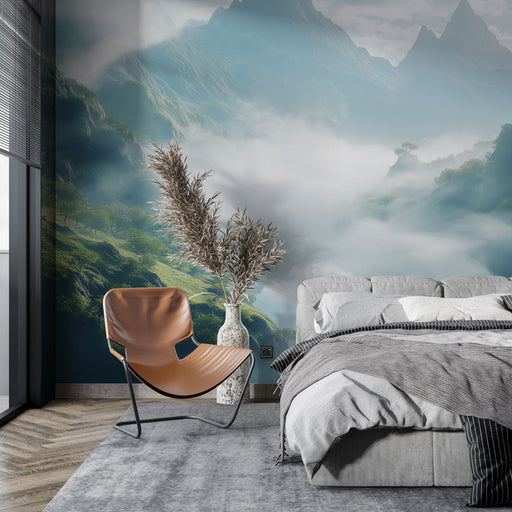 WonderMuralUnsere exklusive Tapete zeigt eine Landschaft majestätischer Berge, die im Nebel gehüllt sind und eine friedliche und beruhigende Atmosphäre schaff...