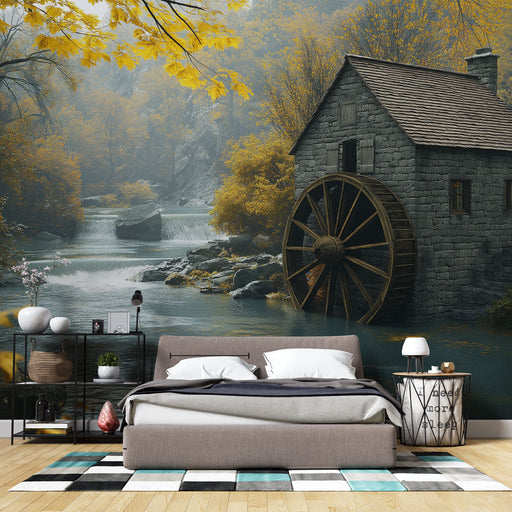 WonderMuralEntdecken Sie unsere schöne Tapete, die eine malerische Wassermühle zeigt, eingebettet an einem ruhigen Fluss. Die goldenen Blätter der umliegenden...