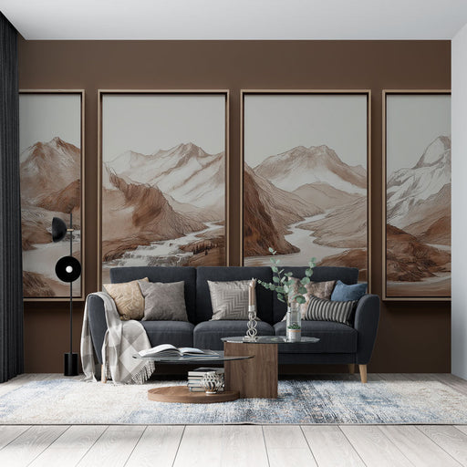 WonderMuralUnsere originale Tapete zeigt eine Serie von vier stilisierten Illustrationen von bergigen Landschaften, die warme Brauntöne hervorheben. Die zarte...