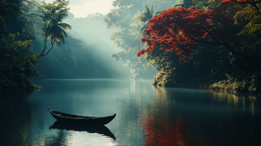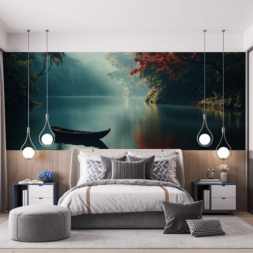 WonderMuralUnsere Tapete repräsentiert eine ruhige nautische Landschaft, in der ein kleines Boot friedlich auf ruhigem Wasser ruht, das mit Grüntönen und Lich...
