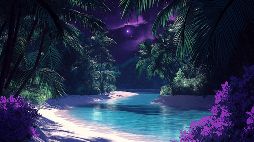 Vollständige Details anzeigenTapete Landschaft | Funkelnder Fluss unter Palmen unter einem sternenklaren Himmel