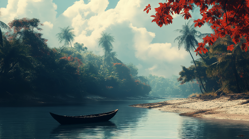 Vollständige Details anzeigenTapete tropische Landschaft | Friedlicher Fluss unter einem lebendigen Himmel