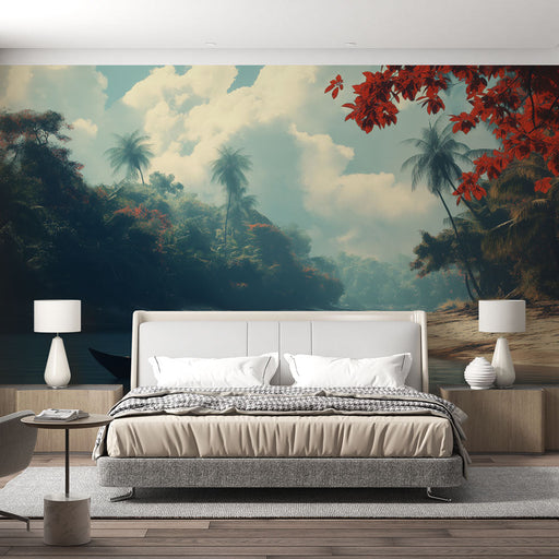 WonderMuralUnsere Tapete ruft eine ruhige tropische Landschaft hervor, mit einem ruhigen Fluss, der von majestätischen Palmen und Blättern in lebendigen Farbe...