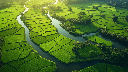 Vollständige Details anzeigenTapete Reisfelder | Weite grüne Reisfelder und ein sich schlängelnder Fluss