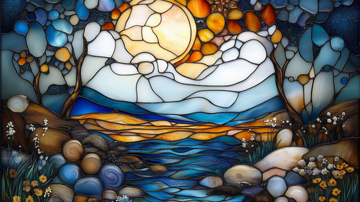 Art'loloEntdecken Sie unsere Tapete Buntglas mit fesselnden Mustern einer Flusslandschaft unter einem sonnigen Himmel. Inspiriert von der Kunst des Buntgla...