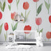 Dieses Wandgemälde zeigt Tulpen, die zart in Aquarellfarben in den Farbtönen Rot, Pink und Grün auf einem hellen weißen Hintergrund gemalt sind. Die Blumen sind in einem minimalistischen Stil dargestellt, mit leichten und fließenden Pinselstrichen, die eine weiche und beruhigende Atmosphäre schaffen.