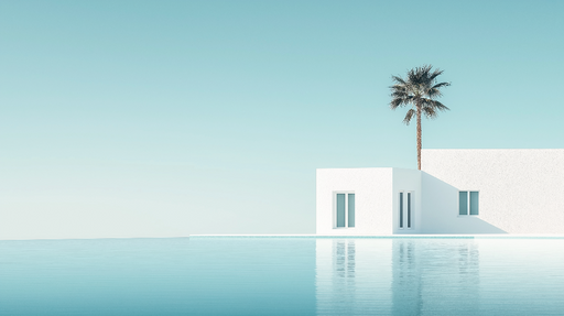 WonderMuralUnsere Tapete zeigt ein modernes weißes Haus, das sich gegen eine ruhige türkisfarbene Wasserreflexion abhebt und eine ruhige und zeitgenössische A...