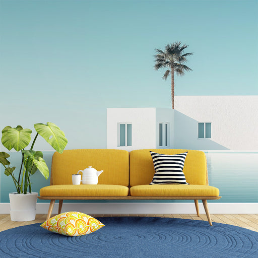 Vollständige Details anzeigenModerne Seaside Tapete | Minimalistisches Design mit Blick auf das Meer und Palmen