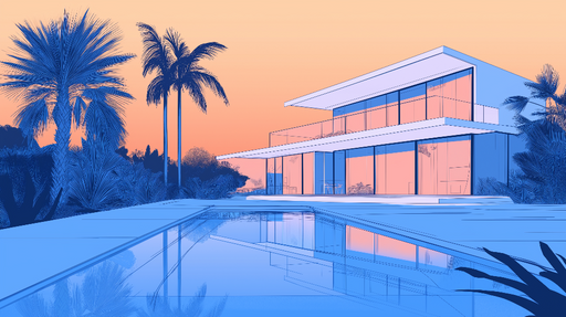 WonderMuralUnsere Tapete zeigt eine wunderschöne Illustration einer modernen Villa, harmonisch in eine tropische Landschaft integriert. Die klaren Linien und ...