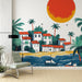 Entdecken Sie unsere lebendige Tapete, die eine charmante tropische Szene darstellt, in der das Meer auf traditionelle Häuser mit Ziegeldächern trifft. Die majestätischen Palmen und die helle Sonne schaffen eine Urlaubsatmosphäre und bringen eine warme Energie in Ihren Raum. Die leuchtenden Farben heben die sonnige und ruhige Seite einer Küstenumgebung hervor.
