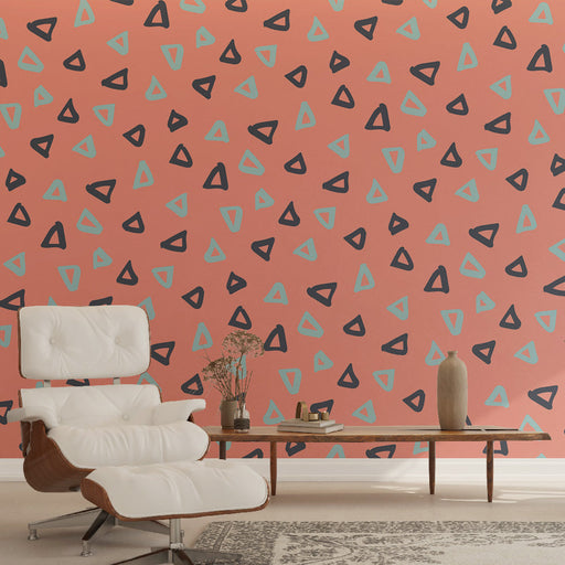 Studio SamaFügen Sie Ihrem Interieur mit unserer geometrischen Tapete mit pastellfarbenen Dreiecksmustern eine Prise Verspieltheit hinzu. Auf einem weichen ro...