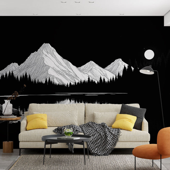 Diese faszinierende Tapete zeigt eine Berglandschaft, die zart in Schwarz-Weiß illustriert ist und eine mystische und beruhigende Atmosphäre schafft. Die schneebedeckten Gipfel spiegeln sich im ruhigen Wasser wider, während ein lunarer Stern am Nachthimmel leuchtet und einen Hauch von Gelassenheit hinzufügt.