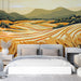 Diese Tapete ruft eine prächtige Weizenlandschaft hervor, die im weichen Licht eines Sonnenuntergangs gebadet wird. Die Felder in goldenen und orangefarbenen Tönen erstrecken sich so weit das Auge reicht und schaffen eine warme und einladende Atmosphäre. Die Hügel im Hintergrund verleihen eine Dimension von Tiefe, während das üppige Laub eine Frische bringt.