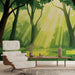 Diese beeindruckende Tapete zeigt einen verzauberten Wald, in dem Sonnenstrahlen durch dichtes Laub dringen und eine beruhigende und natürliche Atmosphäre schaffen. Die vorherrschenden Grüntöne des Designs vermitteln ein Gefühl von Ruhe, während die weichen Schatten der Bäume Tiefe und Charakter hinzufügen.