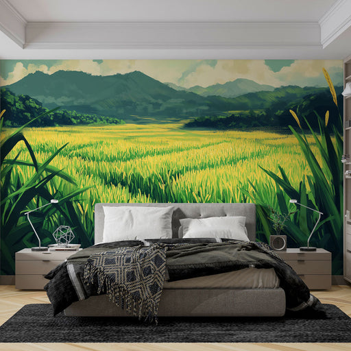 WonderMuralDiese Tapete zeigt eine herrliche Landschaft von Reisfeldern, in der die lebendigen Grüntöne und Gelbtöne sanft verschmelzen und einen strahlenden ...