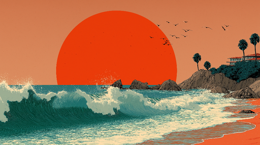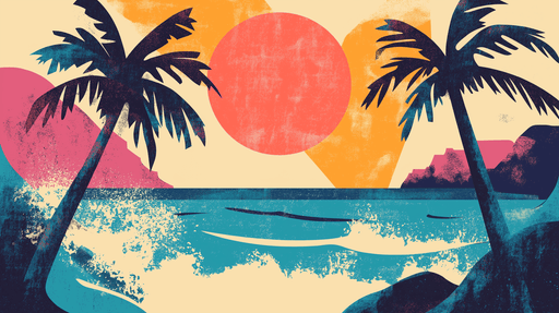 WonderMuralDiese Tapete bringt eine sommerliche Atmosphäre mit ihrer lebendigen Illustration von Palmen und einer großen roten Sonne, die einen idyllischen St...
