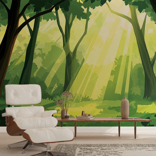 WonderMuralDiese beeindruckende Tapete zeigt einen verzauberten Wald, in dem Sonnenstrahlen durch dichtes Laub dringen und eine beruhigende und natürliche Atm...