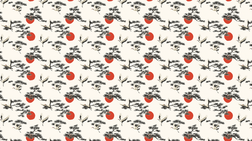 WonderMuralDiese exklusive Tapete zeigt ein Muster, das majestätische Kraniche, symbolische Kiefern und eine aufgehende Sonne kombiniert, alles auf einem eleg...