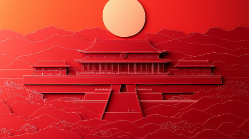 Vollständige Details anzeigenTapete Asiatisches Landschaftsbild | Silhouette eines roten Tempels und aufgehender Sonne
