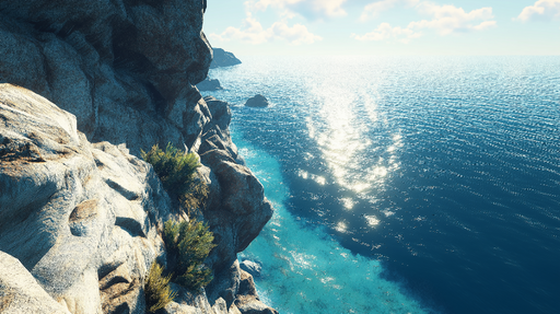 Vollständige Details anzeigenTapete ruhiges Meer | Panoramablick auf ein kristallklares Meer und sonnenbeschienene Klippen