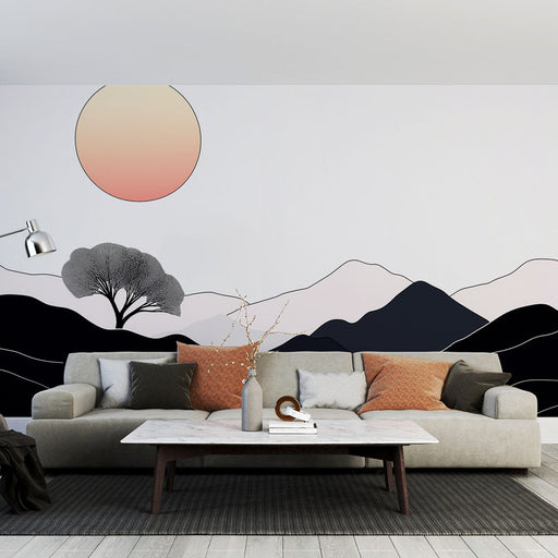 WonderMuralDiese Tapete zeigt eine minimalistische Landschaft, die Gelassenheit und Einfachheit hervorruft. Mit schwarzen Silhouettenbergen und einem zart gez...