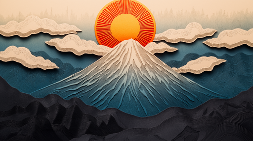 WonderMuralDiese Tapete zeigt eine elegante Illustration eines majestätischen Berges, umgeben von stilisierten Wolken und einer strahlenden Sonne. Die Detai...