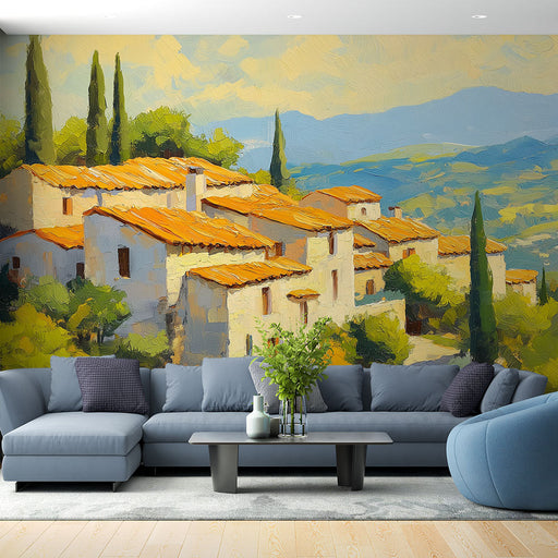 WonderMuralDiese Wandtapete ruft ein charmantes provencalisches Dorf mit weißen Häusern unter einem sonnigen Himmel hervor, umgeben von viel Grün und hohen Zy...