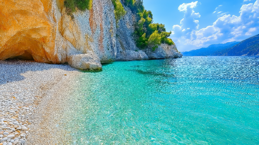 Vollständige Details anzeigenTapete paradiesstrand | Kieselstrand und türkisfarbenes Meer unter dem sonnigen Himmel