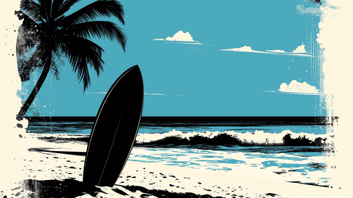 WonderMuralDiese Tapete erzeugt eine Sommeratmosphäre mit einem grafischen Design, das ein Surfbrett vor einem maritimen Hintergrund zeigt. Die cyan und schwa...