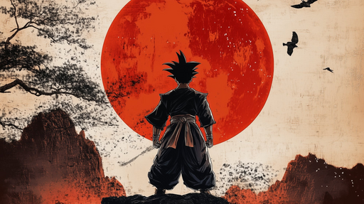 Art'loloDiese Krieger-Tapete zeigt die Silhouette eines Kriegers, der vor einer großen roten Sonne steht. Mit Elementen der Natur und fliegenden Vögeln ver...