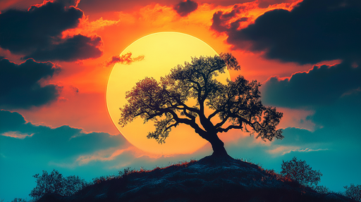 Vollständige Details anzeigenTapete baum des lebens | Baum vor einer großen sonne silhouettiert
