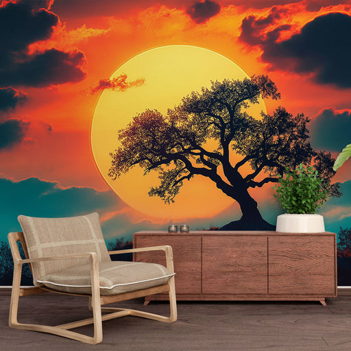 WonderMuralDiese faszinierende Tapete zeigt einen majestätischen Baum, der sich vor einem weiten Sonnenuntergang abhebt, bei dem lebendige Schattierungen von ...