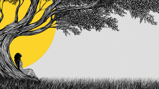 Vollständige Details anzeigenTapete Baum und Sonne | Silhouette einer Frau unter einem großen Baum und einer gelben Sonne