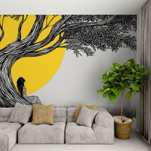 WonderMuralUnsere hervorragende Tapete zeigt einen majestätischen Baum mit stilisierten Ästen, die einer nachdenklichen Silhouette einen sanften Schatten biet...