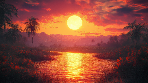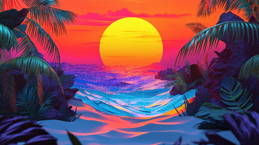 Vollständige Details anzeigenTapete Sonnenuntergang | Eine lebendige tropische Landschaft mit einer strahlenden Sonne