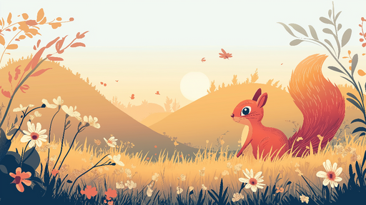 WonderMuralDiese bezaubernde Tapete illustriert ein fröhliches Eichhörnchen, das sich zwischen zarten Blumen und goldenen Gräsern bewegt und eine warme und ei...