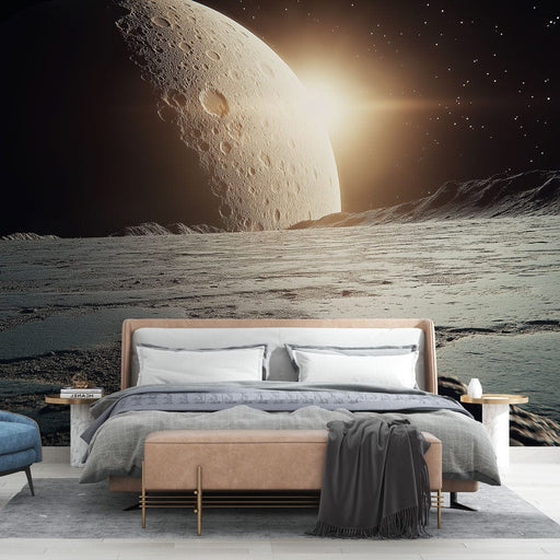 WonderMuralDiese faszinierende Tapete zeigt eine mondlandschaft, in der die felsige Oberfläche im goldenen Licht einer strahlenden Sonne erstrahlt. Die grafis...