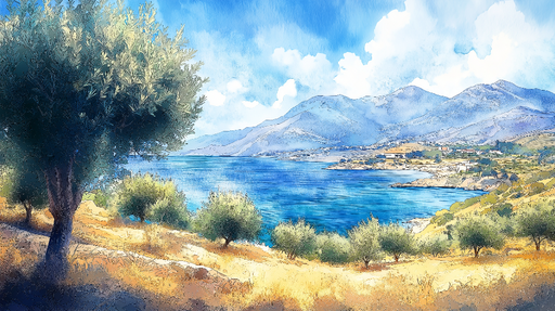 Vollständige Details anzeigenTapete olive-tree | Panoramablick auf das Meer und sonnige Hügel