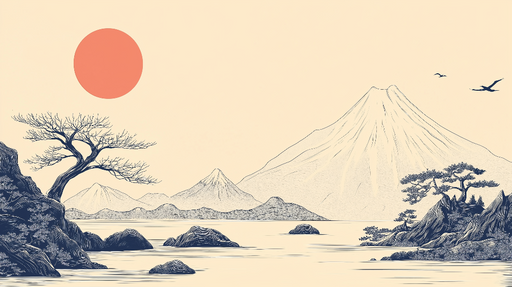 WonderMuralUnsere Tapete ruft eine ruhige traditionelle japanische Landschaft hervor, die schöne Berge und eine brillant stilisierte rote Sonne zeigt. Die fei...