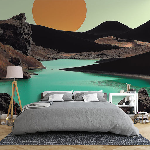 WonderMuralDiese faszinierende Tapete zeigt eine surreale Landschaft , in der dunkle Berge und ein türkisfarbener Fluss verschmelzen und ein Gefühl von Trau...