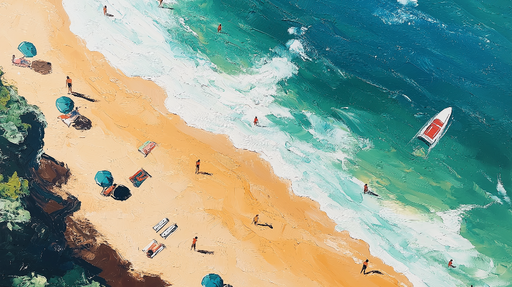 WonderMuralUnsere Tapete zeigt eine lebendige sonnige Strandszene, wobei türkisfarbene Sonnenschirme einen Farbtupfer am goldenen Ufer setzen. Schwimmer genie...