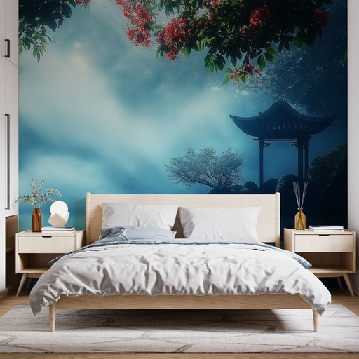 WonderMuralUnsere zarte Tapete illustriert einen asiatischen Tempel, der von einer Atmosphäre der Gelassenheit umgeben ist, umgeben von Bergen und Kiefernwäld...
