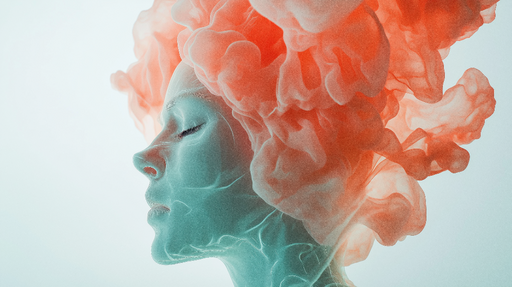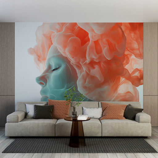 WonderMuralEinladende poetische Schwärmerei, die Mural Wallpaper Éclat Fumant zeigt eine elegante Silhouette, deren Kopf von Wirbeln aus Rauch in Korallen- un...