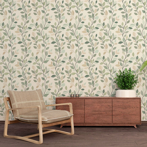 WonderMuralUnsere Tapete zeigt ein attraktives Muster von zarten Blättern in sanften Grüntönen und Beige, was eine beruhigende und natürliche Atmosphäre schaf...