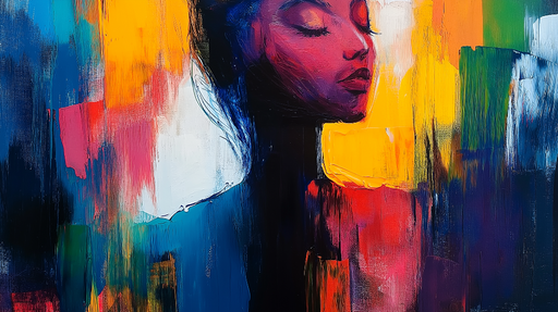 WonderMuralDiese faszinierende Tapete zeigt ein abstraktes Porträt einer Frau, umgeben von lebendigen Farben in Blau, Rot, Gelb und Grün. Die reichhaltigen un...