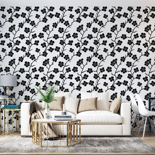 WonderMuralDiese Tapete zeigt ein elegantes Muster aus schwarzen Ästen, die mit kleinen schwarzen Blumen verziert sind und so einen markanten Kontrast auf ein...
