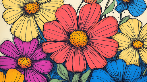 WonderMuralEntdecken Sie unsere atemberaubende Fototapete mit einem lebendigen Blumenmuster, das eine Explosion von Farben mit rosa, gelben, blauen und roten ...