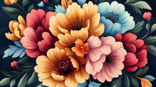 WonderMuralDiese Tapete zeigt ein lebhaftes Blumendesign mit prächtigen gelben, orangefarbenen und blauen Blumen auf dunklem Hintergrund. Die akribischen Deta...