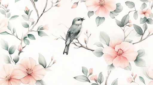 WonderMuralUnsere schäbige schicke Tapete zeigt einen zarten Vogel, der auf einem Ast sitzt, umgeben von wunderschönen rosa Blumen und grünen Blättern. Dieses...